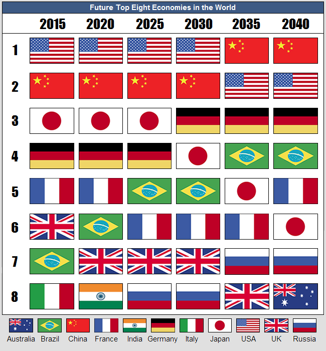 Rather conservative graphic about the future top eight. Using purchasing power parity rates (PPP) China should surpass the US by the end of the decade (OECD and IMF saying earlier). Even using nominal exchange rates, China should top the US between 2025-2030.