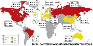 This ranking runs counter to Northern American perceptions of energy efficiency around the globe. In its first International Energy-Efficiency Scoreboard ranking of 12 major powers, the American Council for an Energy-Efficient Economy (ACEEE)scored Canada and the US lower than the several European countries, Japan, EU, China, and Australia. China tied for 6th and Canada was second last (ahead of Russia).