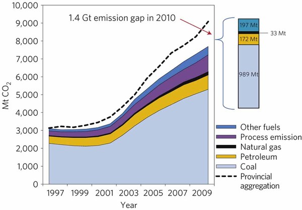 Comparing national data to aggregates of provincial data, the team found a discrepancy equivalent to about 5% of the global total (in 2008), more than the emissions of Japan, the world’s fourth largest polluter. According to the National Bureau of Statistics (NBS), China’s CO2 emissions had grown at 7.5% annually from 3.1 billion tonnes in 1997 to 7.693 billion tonnes in 2010. However, aggregates of provincial statistics pointed to a growth rate that may be closer to 8.5%, rising from 3.131 billion tonnes to 9.084 billion tonnes.